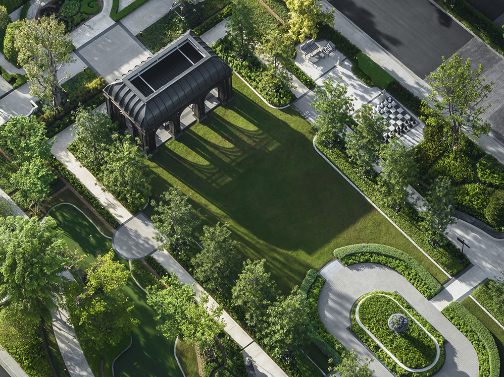 พื้นที่ส่วนกลางขนาดใหญ่ที่ได้รับแรงบันดาลใจจากสวน Tuileries Garden ประเทศฝรั่งเศส